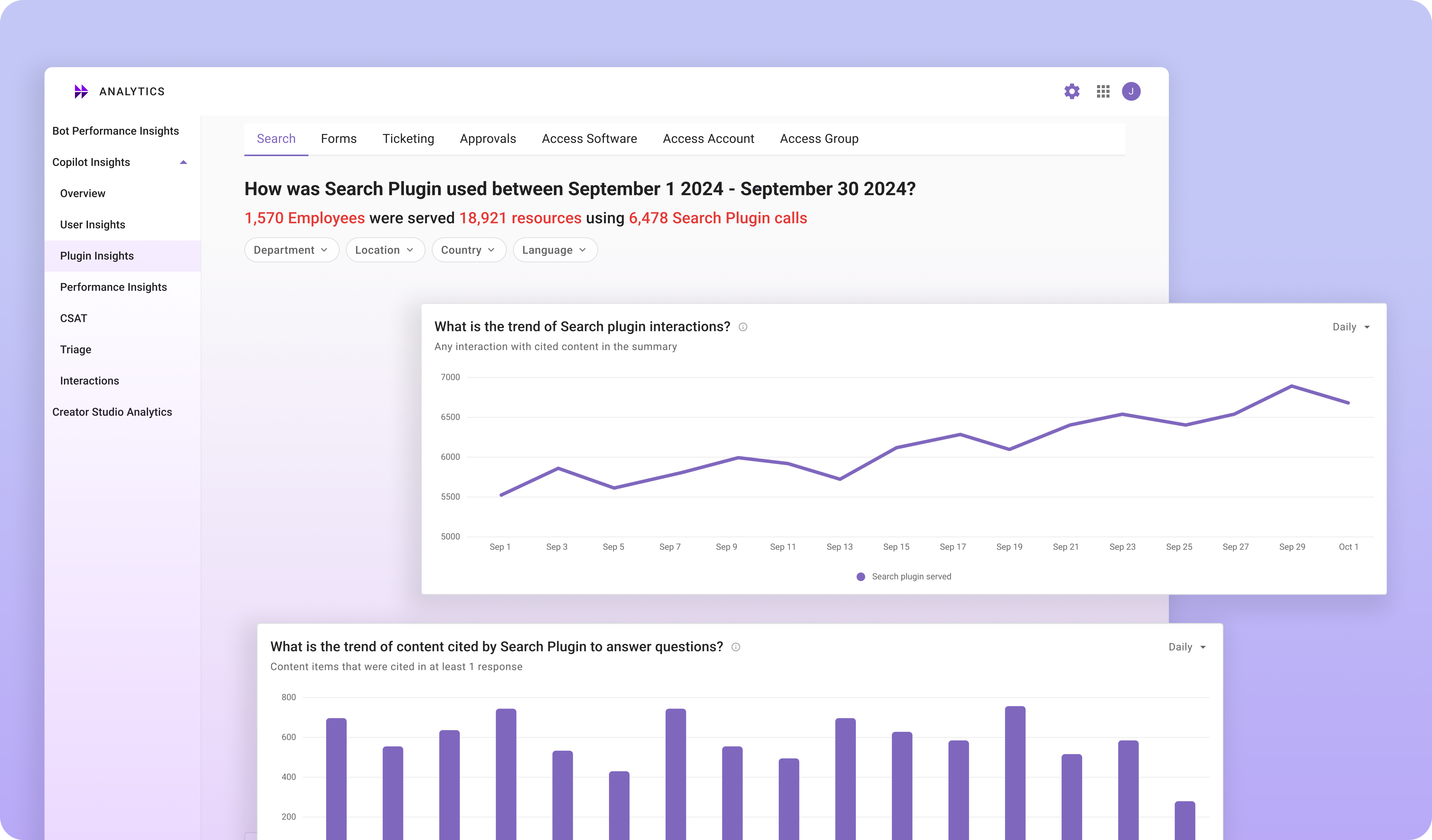 Get usage insight and utterance-level visibility to understand key metrics around user trends, in-demand topics, and content quality.