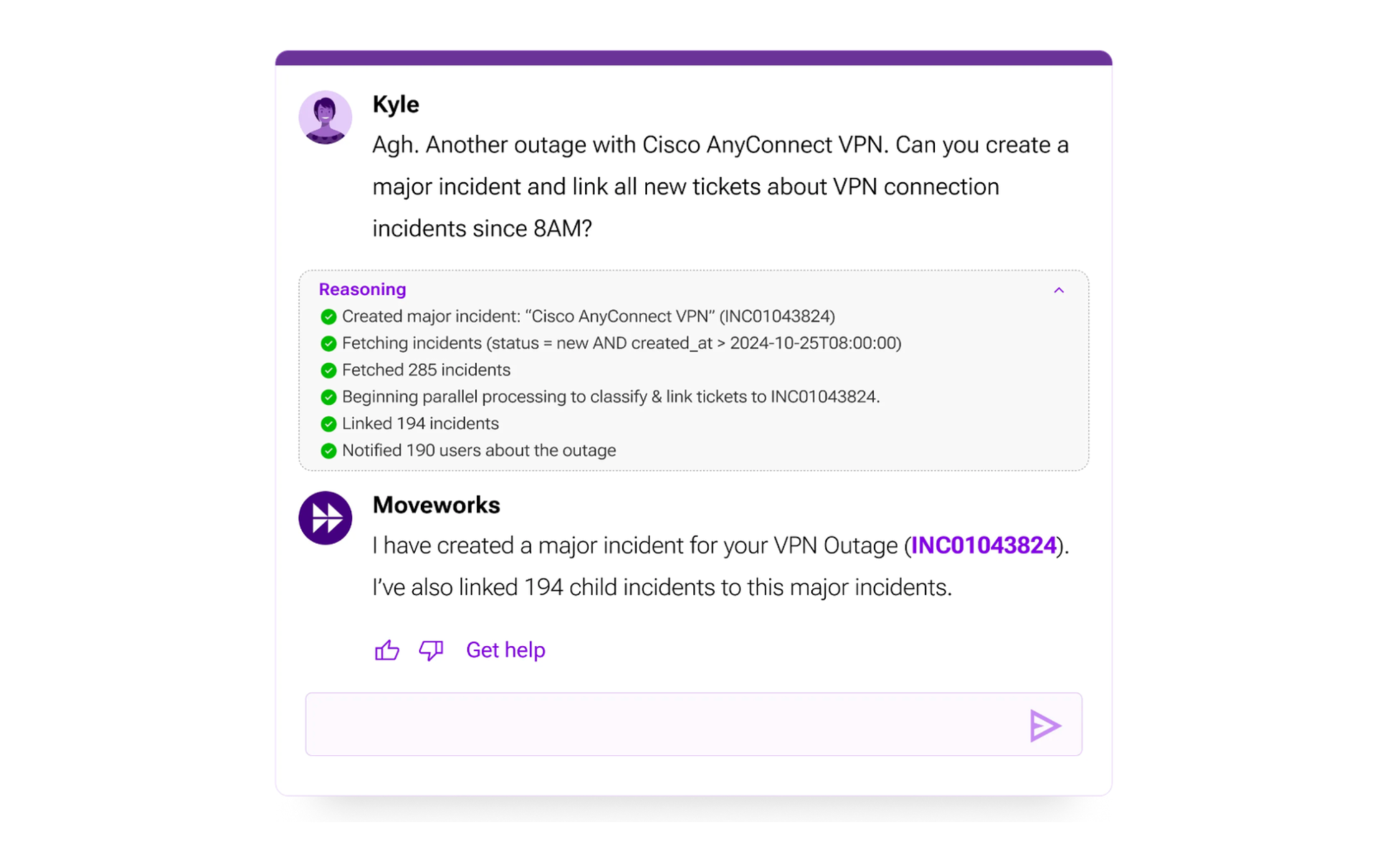 Whenever an outage occurs, IT agents are typically overwhelmed with hundreds, if not thousands, of IT tickets all about the same outage. To keep themselves organized, they typically create a “major incident” to track the outage and link all these tickets to the outage ticket – but this process can still take hours for your team to read every single ticket, determine if it’s related to the outage, and link it to the major incident.