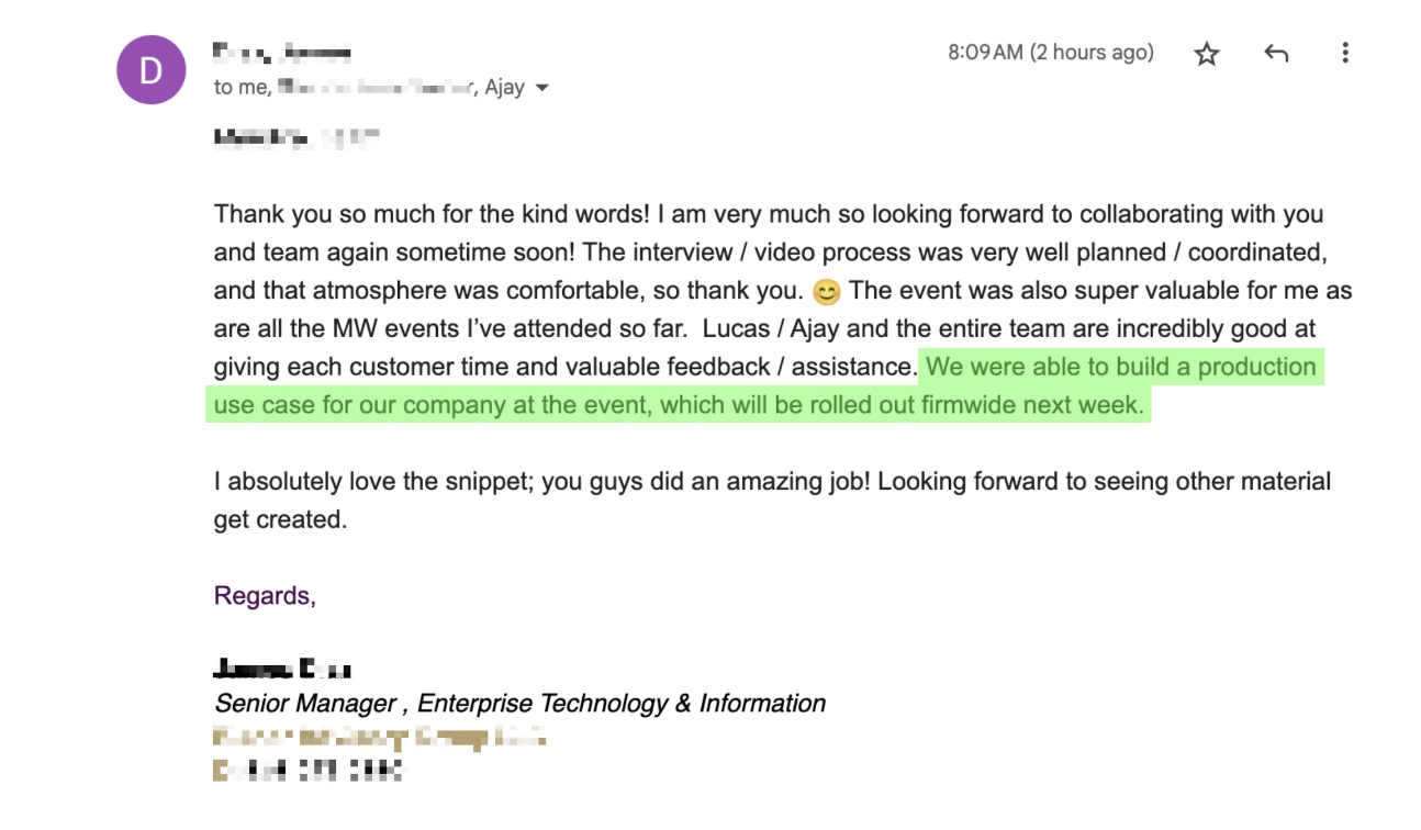 That’s why we were so thrilled to see this email come in shortly after the hackathon from one of our attendees.