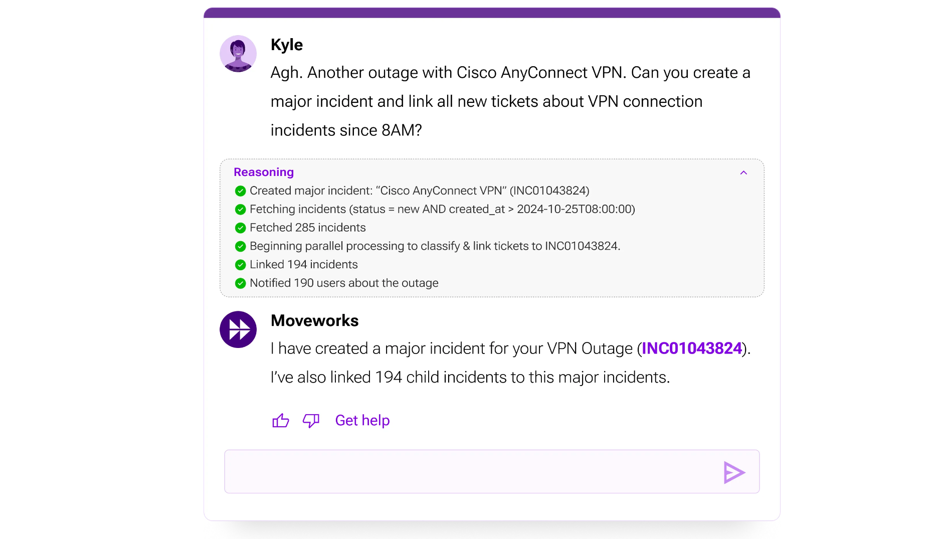 Whenever an outage occurs, IT agents are overwhelmed with hundreds, if not thousands, of IT tickets all about the same outage. To keep themselves organized, they typically create a “major incident” to track the outage and link all these tickets to the outage ticket – but this process takes hours to read every single ticket, determine if it’s related to the outage, and link it to the major incident.