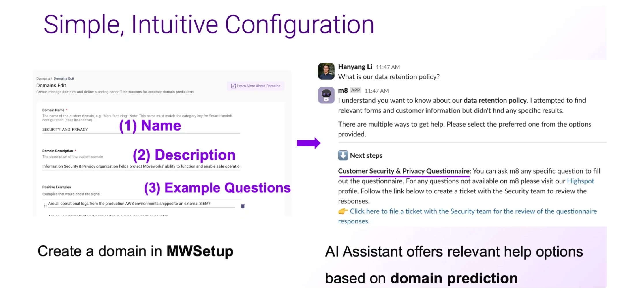 We introduced a UI-based configuration tool in Moveworks Setup that allows customers to create and edit domains effortlessly. Users simply need to provide a domain name, description, positive examples, and negative examples. This self-service approach empowers stakeholders to customize domains without extensive technical knowledge.