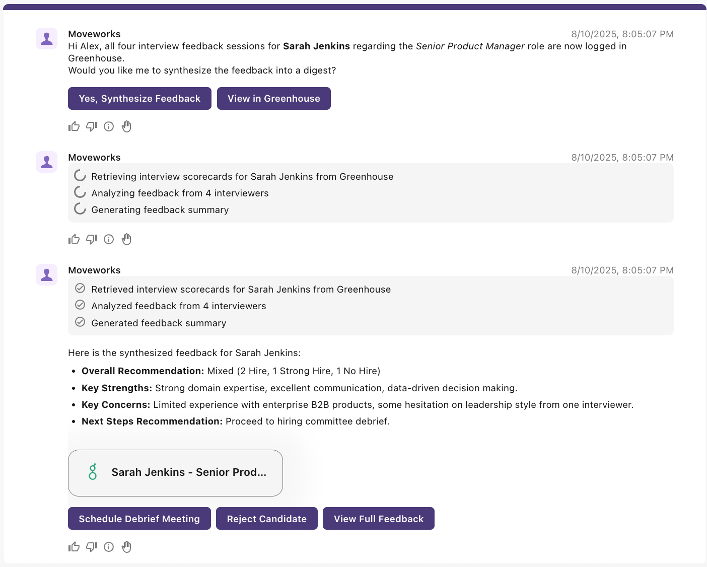 An Ambient agent that monitors when all interview scorecards are submitted, summarizes key themes and candidate feedback, and delivers a digest to the hiring manager ahead of the debrief, driving faster, more informed hiring decisions.