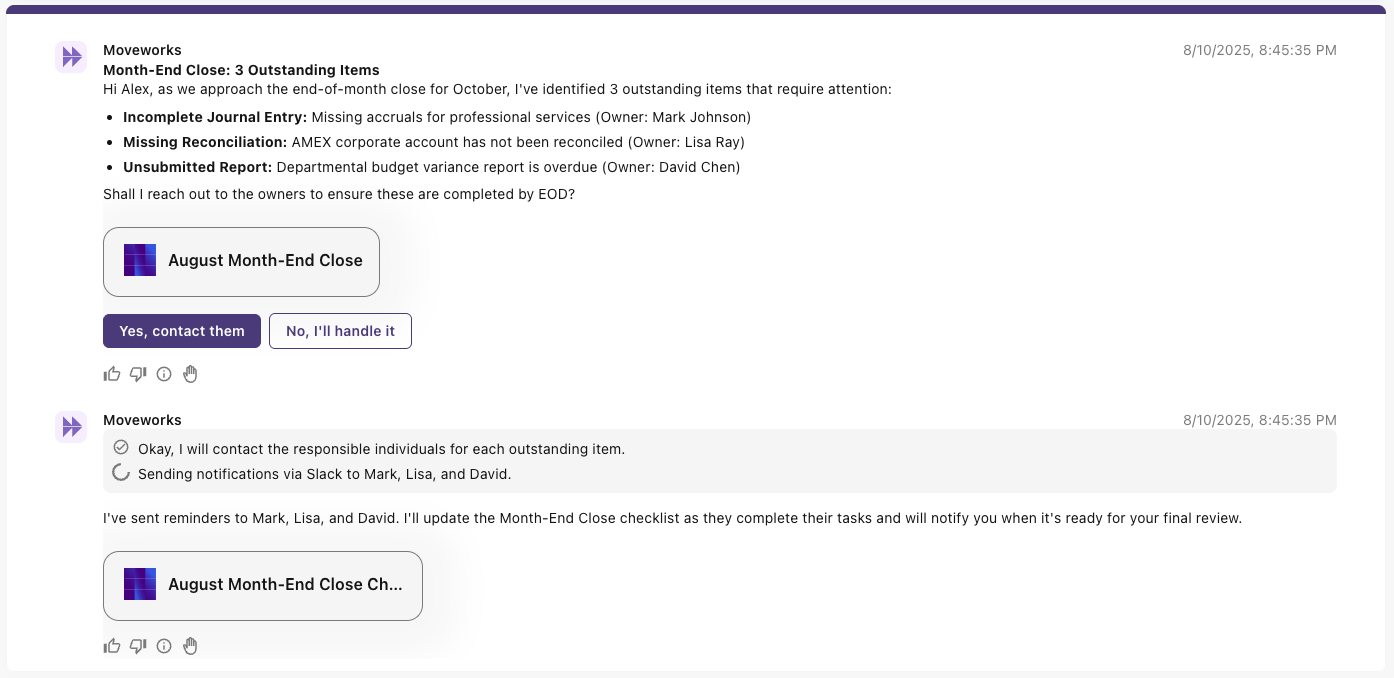 An Ambient agent that monitors the finance system for outstanding items: incomplete journal entries, missing reconciliations, or unsubmitted reports. It automatically reaches out to the respective leaders with the specific details needed, gathers responses, and compiles a ready-to-review checklist for the controller to streamline the close process.