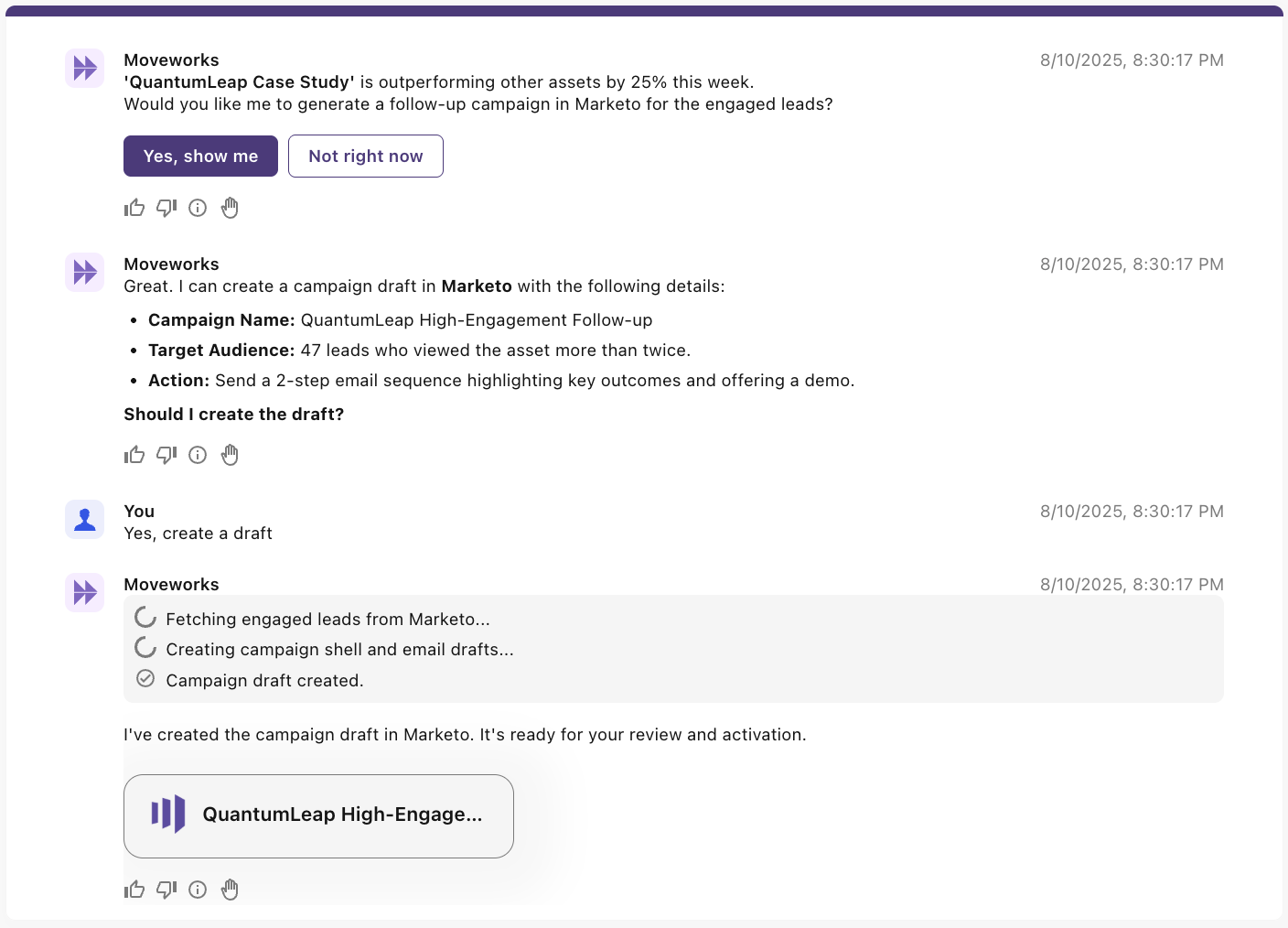 An Ambient agent that monitors content performance and triggers a workflow once an asset hits a defined threshold. It then generates a follow-up sequence in Marketo, helping marketing teams engage customers at the right time, keeping audiences engaged.