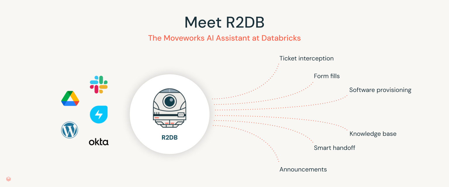 One key part of this strategy was launching R2DB — a conversational AI assistant built with Moveworks that helps employees get work done directly in Slack and email.