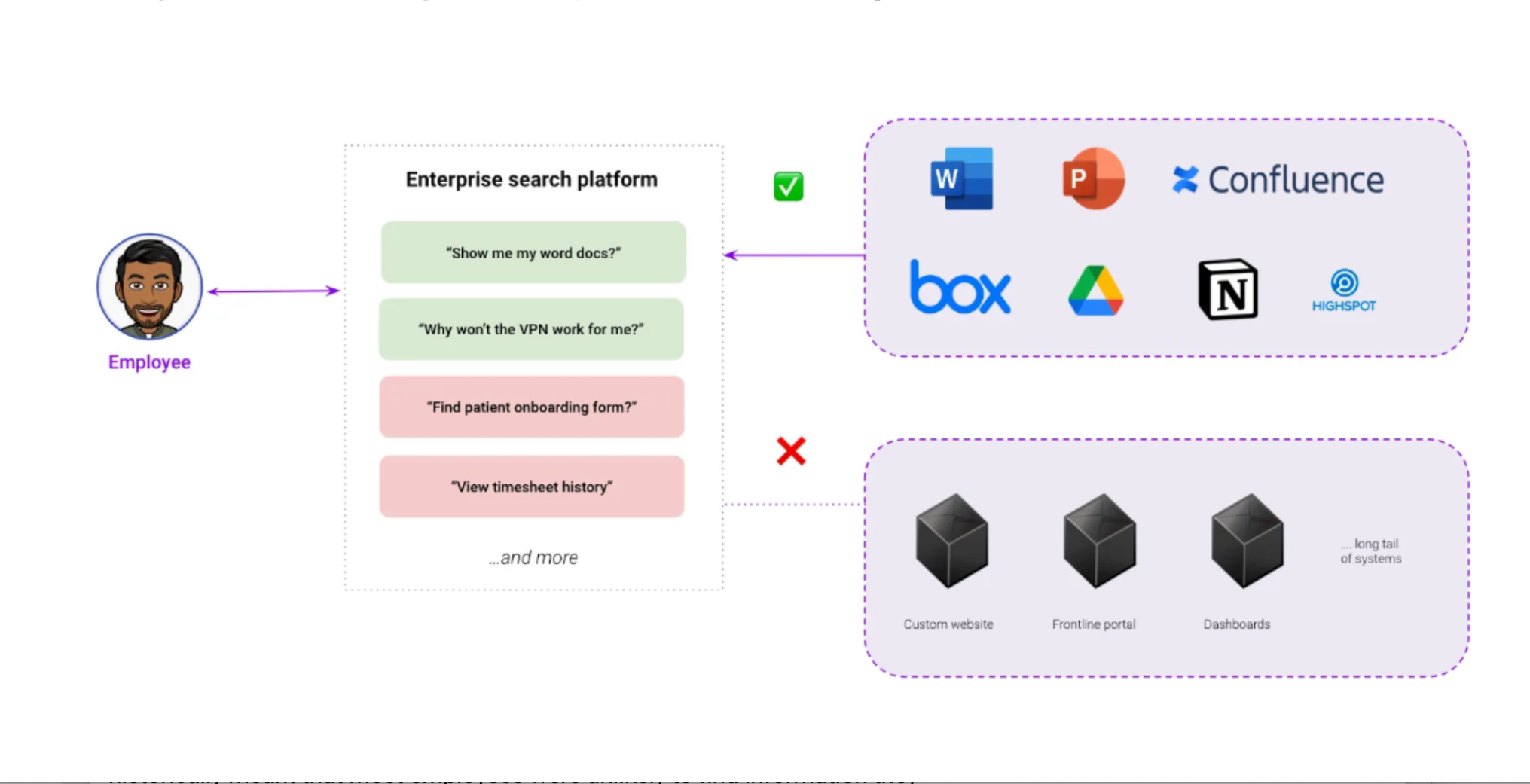 Being able to access and understand this knowledge is crucial for your employees. But as soon as knowledge management exits mainstream tools, the ability to leverage enterprise search products is impeded by the lack of data integrations. Enterprise search systems are powerful at helping employees find information, but they don’t always integrate with many crucial systems – resulting in incomplete search results.