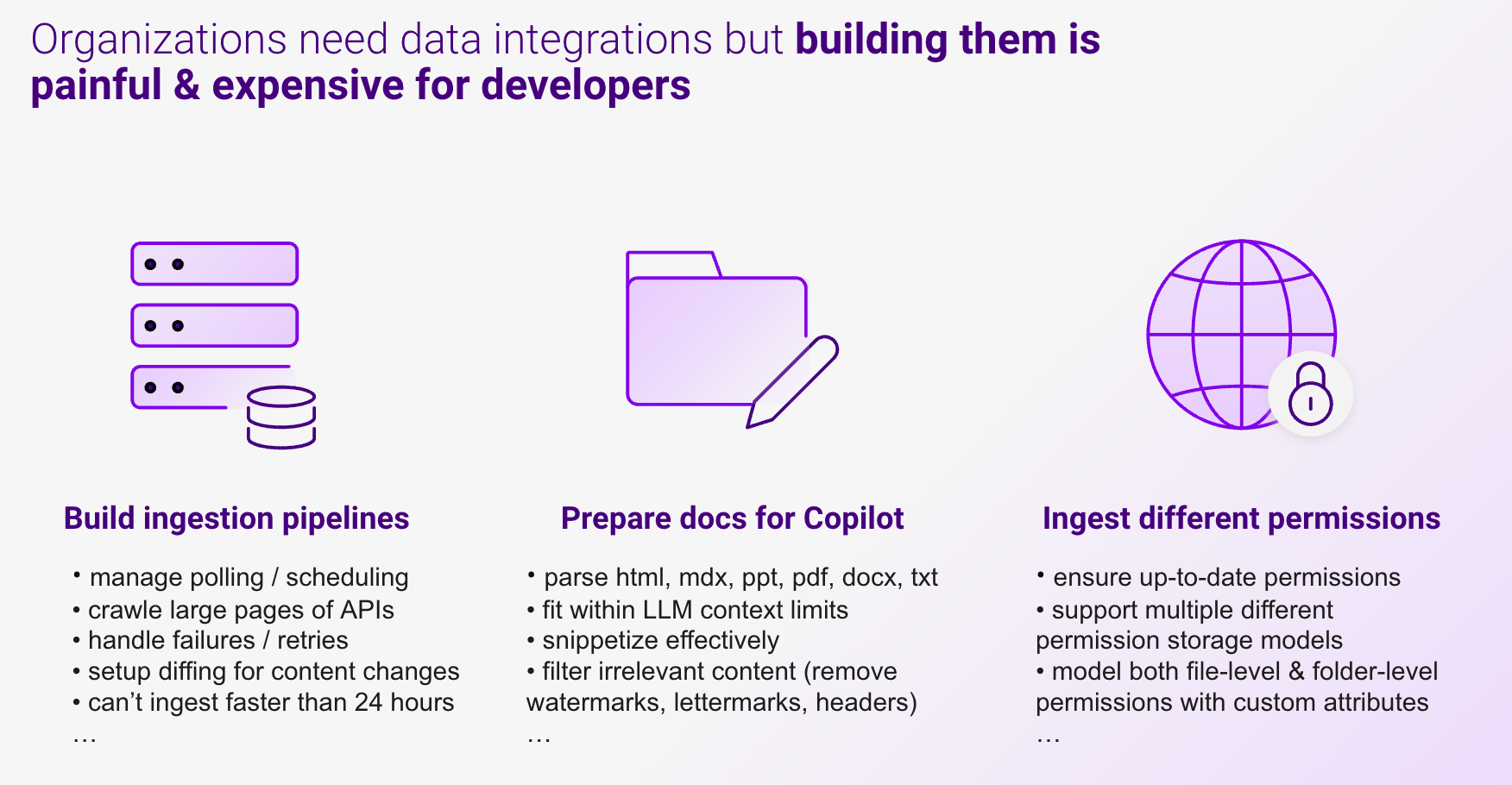 - Build robust ingestion pipelines: They need to manage polling / scheduling, crawling large pages of API responses (often 1000s of files per integration), handle failures / retries, setup diffing for content changes, deal with limitations to ingest faster than 24 hours. This setup requires significant infrastructural overhead & engineering expertise.