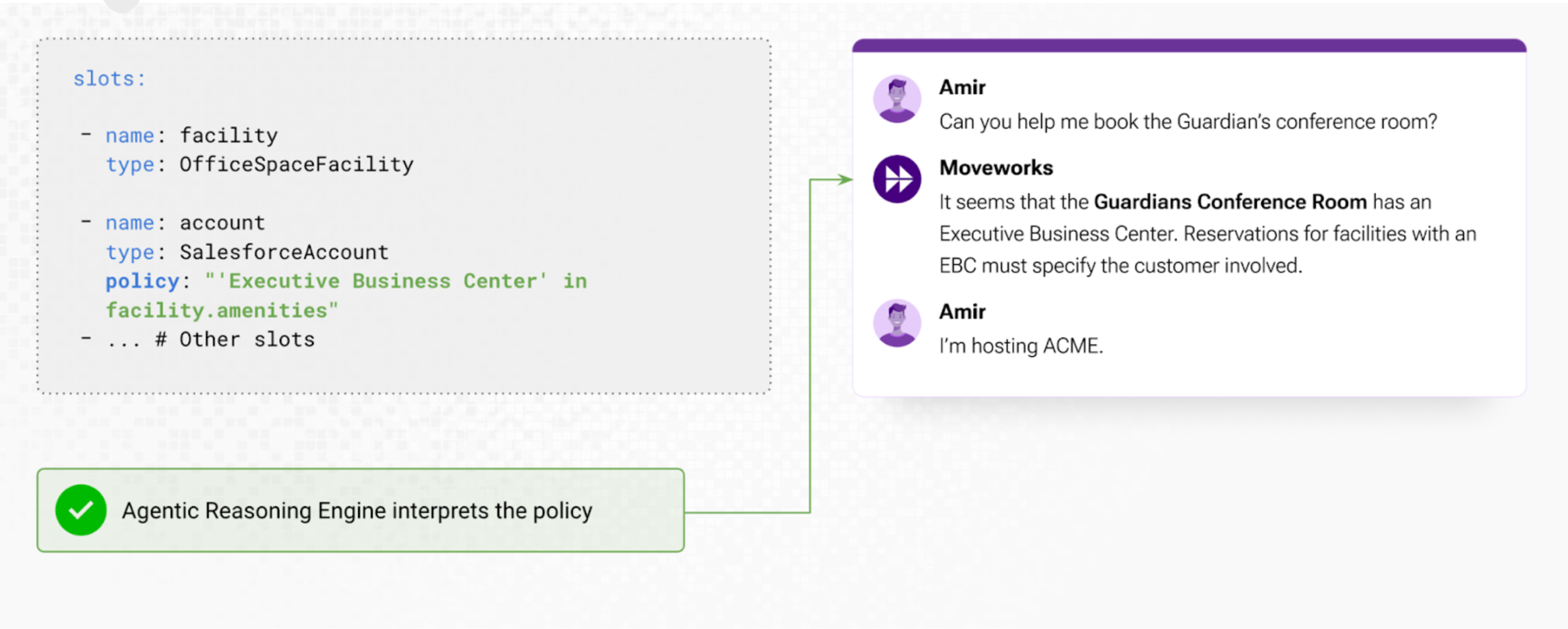 Then, our Agentic Automation Engine validates that all requirements are met. In this case, it noticed that there was a Policy Validator on the “account” slot. It noticed the OfficeSpaceFacility had an Executive Business Center listed in the amenities.