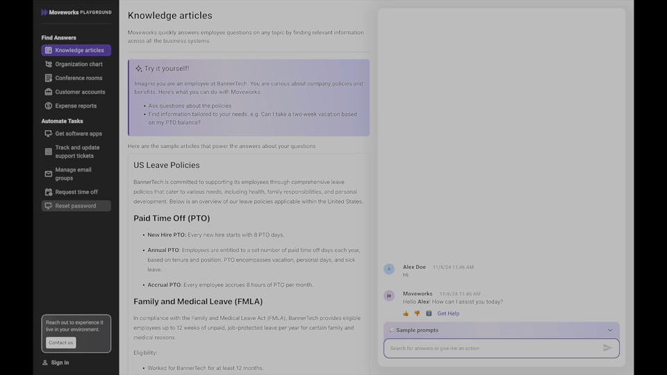 Whether your query is simple or multi-part, Playground is able to handle it. So why not skip the sales call, and try out the power of AI agents in the enterprise for yourself in the Moveworks Playground.