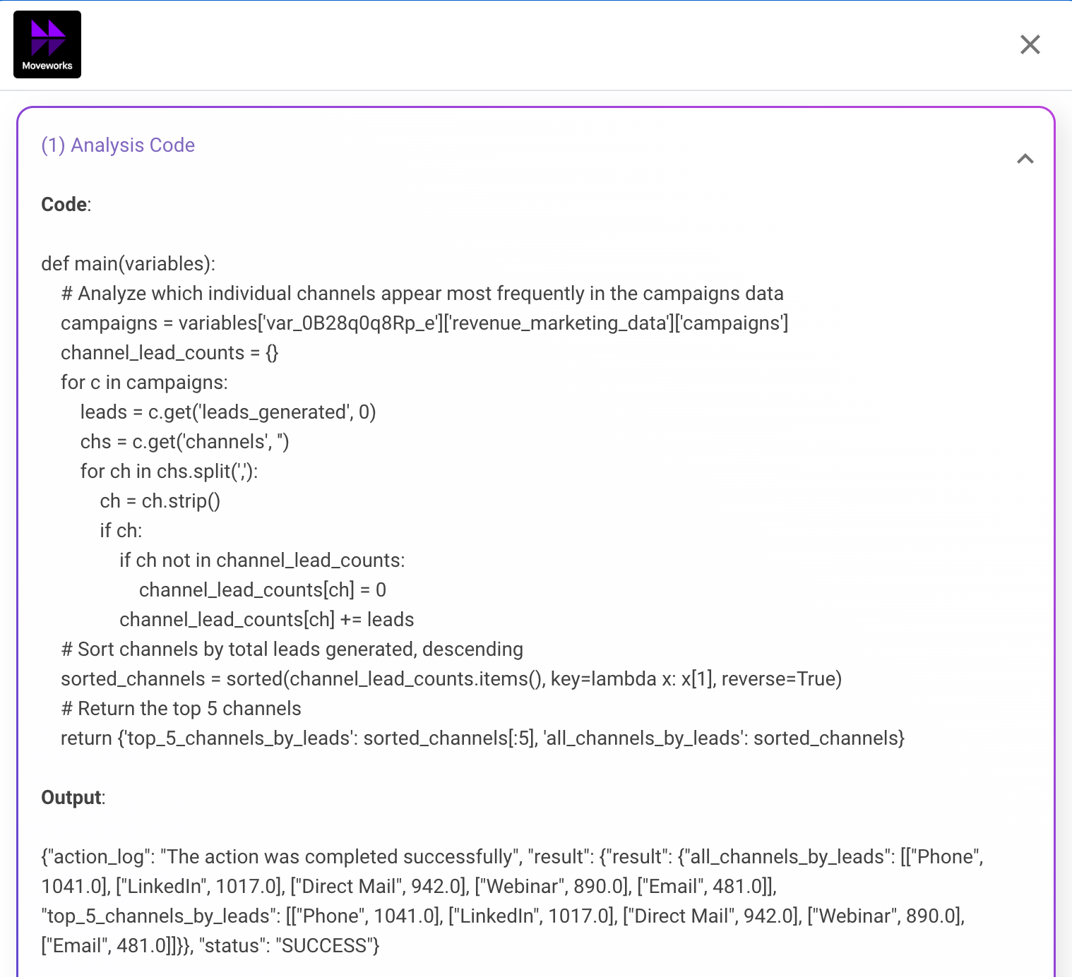Behind the scenes, your AI Assistant pulls the dataset with the Get_B2B_Revenue_Marketing_Data plugin, spins up a sandboxed (an isolated, safe code environment) Code Interpreter to aggregate leads by channel, and then returns a ranked list together with a plain-English explanation and a link to the exact code.