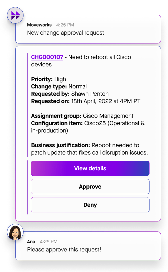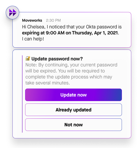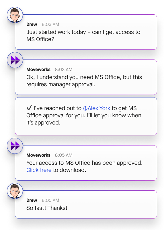 Granting or revoking access should be as simple as sending a message. Moveworks lets you add or remove users from groups or technologies across your organization, automatically.